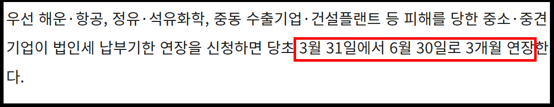 이번 조치로 대상 기업은 기존 3월 31일 법인세 납부기한이 6월 30일까지 3개월 연장됩니다.