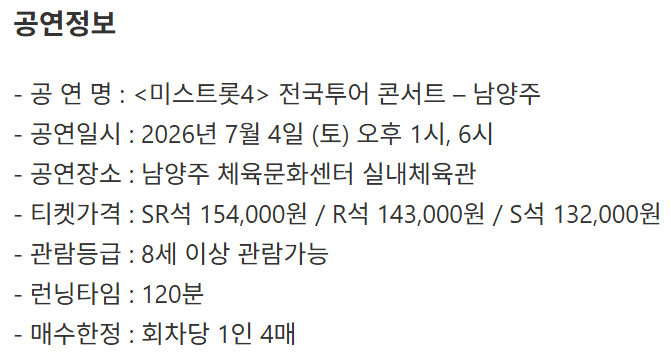 미스트롯4 콘서트 남양주 티켓 예매 일정